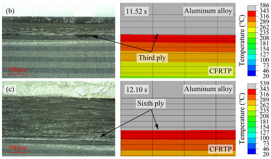 To verify the relationship between the temperature distribution and the melting of the CFRTP composite, the observed interfacial bonding processes and the corresponding temperature distributions at the material end faces in the simulation were compared as shown in Figure 5 and Figure 6. In the observed results, the melting of the polymer matrix caused the thickness change in the CFRTP composite, and the melting depth of the CFRTP composite was difficult to accurately determine; therefore, the number of melted plies of CFRTP composite was used to compare the simulated and observed results. In the simulation results, the melting temperature (343 °C) of the PEEK polymer was used as the melting boundary criterion, and the corresponding melting area was indicated in gray. When the interface was not filled with polymer, Figure 5a shows the results at a laser power of 400 W. The position change of the fibers in the CFRTP composite and the cracking between the matrix and fibers were observed in the first ply, whereas the other plies were unchanged, indicating that melting only occurred in the first ply. Continuing to increase the laser power to 500 W and 600 W, the melting of the three and six plies, as shown in Figure 5b,c, respectively, was found in the observed results using a similar criterion. The observed number of melted plies was the same as the number of melted plies in the gray area in the simulation, indicating that there was a correlation between the number of melted plies and the temperature distribution. With the increase in laser power, the time corresponding to the maximum number of melted plies was delayed because the temperature of the aluminum alloy was higher at higher laser powers, and the CFRTP composite was still heated by a high-temperature aluminum alloy after the laser stopped irradiating the observation area. However, when the number of melted plies increased, the fibers in the direction of the parallel end faces were extruded, which affected the observation of the interfacial bonding process.