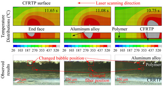 To investigate the effect of bubbles formed by the thermal decomposition of molten polymer on the bonding process, the results of interfacial observations and temperature simulations were extracted for the laser powers of 600 W, shown in Figure 7, and 700 W shown in Figure 8, where the gray area in the temperature distribution was the area beyond the thermal decomposition temperature of the polymer (520 °C). When the laser power was 600 W, the surface temperature of the polymer layer exceeded the thermal decomposition temperature, and bubbles were observed on the corresponding surface of the polymer during the last laser scan. The temperature simulation results showed that the local temperature of the polymer surface exceeded the thermal decomposition temperature at 10.75 s, and the peak temperature of the polymer surface decreased as the laser scanned from the edge to the center. However, from the observations of the corresponding moments, it was found that the bubbles moved toward the laser scanning direction, resulting in the presence of bubbles in all the moments, which may be related to the thermal convection caused by the uneven temperature. Meanwhile, similar fiber position changes were found in the CFRTP composite, but the fiber position change was smaller than the bubbles in the molten polymer because of the constraints from the fiber axial direction. When the laser power was 700 W, as shown in Figure 8, the surface temperature of the thermoplastic polymer exceeded the thermal decomposition temperature at 9.00 s, and bubbles appeared not only on the surface of the molten polymer, but also in the contact area with the CFRTP composite. Since the thermal conductivity of the gas in bubbles was significantly lower than that of the molten polymer, the bubbles reduced the heat transfer from the polymer to the CFRTP composite, which on the one hand made it easier to generate high temperatures in the molten polymer and exacerbated thermal degradation, and on the other hand reduced the number of melted plies of the CFRTP composite, which resulted in a lower number of melted plies than that of the simulation results.