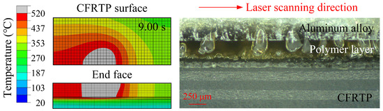 (2) The number of melted plies in the CFRTP composite obtained with the simulation were the same as the observed results, when thermal decomposition of the polymer did not occur. Affected by the low thermal conductivity of the CFRTP composite and polymer, the largest temperature gradient occurred at the contact area with the aluminum alloy. Regardless of whether the interface was filled with a polymer layer or not, the temperature gradient along the material thickness direction was larger than that along the laser scanning direction, which was about 400 °C/mm and 40 °C/mm, respectively.