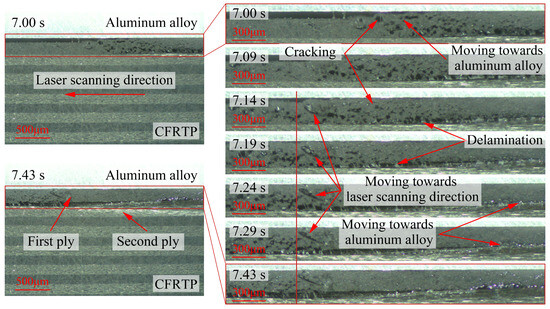 When the interface was not filled with polymer, Figure 9 shows the interfacial bonding process between the CFRTP composite and the aluminum alloy at a laser power of 500 W. The laser scanning direction is from right to left, and the laser irradiated the surface of the aluminum alloy in the center of the observation area at 7.00 s. At this moment, a gap of about 60 μm existed at the interface between the CFRTP composite and the aluminum alloy on the left side, while the gap on the right side was filled by the CFRTP composite. As the laser scanned to the left, the fibers in the CFRTP composite moved towards the aluminum alloy driven by the molten polymer matrix and filled the gap in the observed area by 7.19 s. Meanwhile, this also produced cracking between the matrix and fibers and formed the delamination between the first and second plies of the CFRTP composite. Similarly, the melting of the polymer matrix in the second ply was observed at 7.24 s, and the movement of the second ply towards the aluminum alloy eliminated the cracking in the first ply, but this likewise produced such defects in the second ply. In addition to the movement of the plies in the CFRTP composite towards the aluminum alloy, movement of the molten polymer matrix together with the fibers towards the laser scanning direction was also found, based on the position change of the cracking in the observations of the material end face from 7.14 s to 7.43 s.