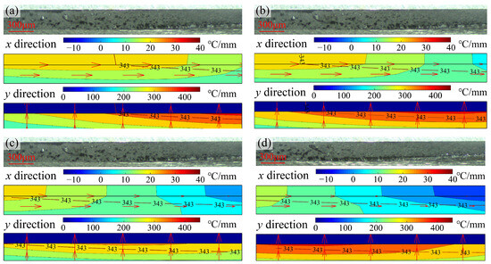 To determine the effects on the interfacial bonding process, the x and y direction temperature gradients at the corresponding moments shown in Figure 10 were drawn. The color meanings in Figure 10 are the same as those in Table 2, red arrows are used to indicate the temperature gradient directions, and red contours in the CFRTP composite indicate the boundaries of the melting area. In all moments, the y direction temperature gradients in the CFRTP composite were directed toward the aluminum alloy, while the direction of the x direction temperature gradients was related to the laser irradiation position. From 7.00 s to 7.14 s, the melting areas surrounded by the contours were basically the same as the areas of the CFRTP composite moving toward the aluminum alloy, indicating that the molten polymer drove the fibers to move toward the aluminum alloy under the large y direction temperature gradient. Meanwhile, since the second ply of the CFRTP composite was not melted, the first ply moved toward the aluminum alloy, causing delamination between it and the second ply. Once the melting of the polymer in the second ply occurred at 7.24 s, the molten polymer and fibers in the second ply moved toward the aluminum alloy, further proving that the temperature gradient in the melting area drove the CFRTP composite to move and the direction was related to the gradient direction. For the movement toward the laser scanning direction, although the temperature gradients from 7.00 s to 7.14 s were in the x+ direction, the observations showed that the polymer matrix drove the fibers to move in the x− direction, whereas temperature gradients toward the x− direction appeared in the observation area at 7.24 s. This was because the flow of the molten polymer in the CFRTP composite was influenced by the fibers; under the extrusion effect of the scanned area and the support effect of the unscanned area, the movement of the molten polymer and fibers in the x direction was affected by the movement which occurred away from the observation area.