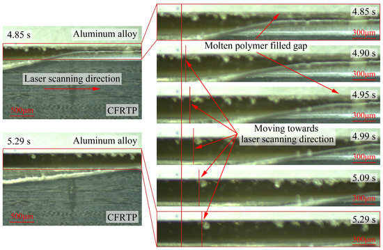 The interfacial bonding processes when the interface was filled with the polymer layer are shown in Figure 11, with a laser power of 600 W. The polymer began to melt at 4.85 s in the observation area, corresponding to the laser scanning direction from left to right. Due to the better melt fluidity of the pure polymer, the gas in the gap between the polymer and the aluminum alloy could not be vented in time, and bubbles were found in the molten polymer near the aluminum alloy in the observation results. As the laser scanned to the right, the molten polymer gradually filled the gap between the polymer and the aluminum alloy, accompanied by the movement of bubbles along the laser scanning direction, while there was no significant change in the position in the thickness direction. Compared with laser direct joining without filling the polymer layer, the polymer layer could rapidly infiltrate the aluminum alloy surface after melting. Once the molten polymer filled the gap at the material interface, the fixed aluminum alloy limited the movement towards the aluminum alloy. This resulted in the molten polymer moving mainly along the laser scanning direction, avoiding cracking and delamination in the CFRTP composite caused by the movement towards the aluminum alloy.