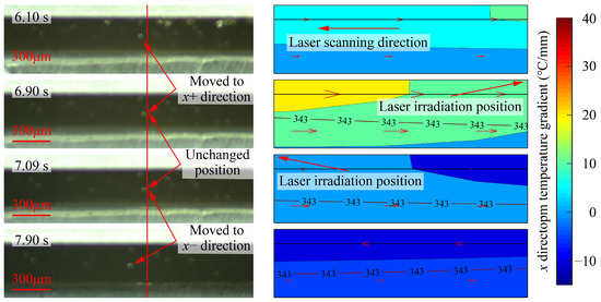 To reveal the motion of the molten polymer layer during the interfacial bonding process, the observations and temperature gradients in a single laser scan were analyzed, that is, the laser direct joining processes from 6.10 s to 7.90 are shown in Figure 12. The laser scanning direction was from right to left, and the laser irradiation position was on the sides of the aluminum alloy at 6.10 s and 7.90 s, while the laser irradiation position was on the sides of the observation area at 6.90 s and 7.09 s. From 6.10 s to 6.90 s, when the laser scanned the right side of the outer observation area, the bubble in the molten polymer appeared to move to the x+ direction, whereas the bubble position was unchanged when the laser scanned the observation area from 6.90 s to 7.09 s. Furthermore, the bubble moved to the x− direction when the laser scanned the left side of the outer observation area from 7.09 s to 7.90 s. The x direction temperature gradients in the observation area followed the same trend as those of the bubble movement, that is, the x direction temperature gradient was positive when the bubble moved to the x+ direction, gradually decreased to zero when the bubble position was unchanged, and there was a negative x direction temperature gradient when the bubble moved to the x−direction at 7.09 s. The above results proved that the direction of the temperature gradient was the key to determine the flow of molten polymer, and the molten polymer flowed faster when the direction of the temperature gradient was the same as the laser scanning direction.