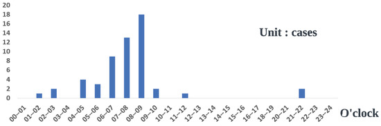 In Figure 1, yearly traffic accidents in Korea caused by black ice for 24 h are shown [19]. According to the graph, the majority of the accidents caused by black ice occur in the morning from 6 a.m. to 10 a.m. From the figure that is provided by an official source, we can observe 80–85% of the accidents caused by black ice occur during the daylight. In [20], multi-wavelength, non-contact optical technology was used as a method for detecting black ice, pointing out the differences in normalized reflectance under dry, wet, black ice, snowy, and icy conditions. In [21], to develop a black ice detector, optical sensors and an infrared thermometer were used. An infrared camera has also been used to identify road conditions by using deep learning [22]. Using a millimeter wave sensor with a deep learning model (a 1D Convolutional Neural Network), another detection method achieved 98.2% accuracy [23]. However, mmwave technology is hard to manage in rain and fog when the black ice forms [24,25], as it suffers from attenuation in this kind of situation. Compared to hyperspectral images, the data are also a bit complicated for preprocessing and other custom settings.