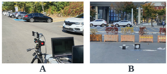 (A) The camera set up. (B) The black ice set up at 10 m distance from the camera.