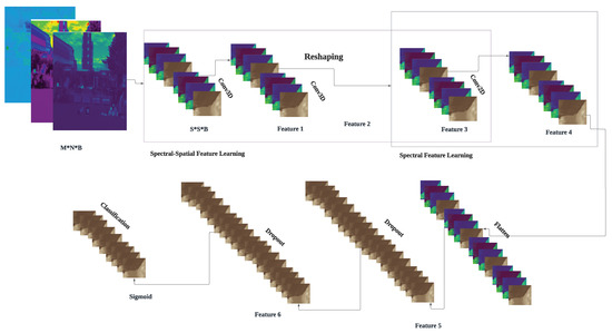 In the past decade, the development of deep learning models has increased rapidly and received widespread attention. Unlike traditional machine learning models, deep learning does not need any patterns because it can learn a pattern from the given data. Thus, it is used in natural language processing, object detection, speech recognition, semantic segmentation, and other branches of computer vision. Many training samples are given to a general deep learning framework to train the model and tune the numerous parameters. Various deep learning models have been used to handle huge datasets of hyperspectral images. In [13], an autoencoder was used for the classification of hyperspectral images. Similarly, the Recurrent Neural Network [14], the Transformer (SpectralFormer) [15], a Deep Belief Network [16], a Deep Recurrent Neural Network [17], and a Convolutional Neural Network [18] have been used for classification of hyperspectral images.