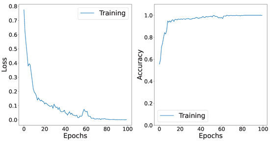 The model ingests incoming data at the input layer. The input has the following shape: (25, 25, 10, 1), which represents a 3D image with dimensions of (25, 25, 10), and (1), which denotes grayscale mode. The shape of the hyperspectral image was 1332 × 854 and the number of bands was reduced to 10 by using PCA. The window size over the image was used in the shape of 25 × 25. As every pixel works as a data point, in this case, we can obtain (Height − Window height) × (Width − Window width) × 10 data points for one single hyperspectral image datum. We divided the points into train, test, and validation set with a 7:2:1 ratio. The final testing for detecting the black ice was done on completely unknown images. The test dataset was taken from different distances. The number of total parameters in our model is 6,629,818. Table 1 shows the parameter details according to the layers and the output/input shapes of the incoming data. The hyperspectral image is already high dimensional, capturing spectral and spatial information for all pixels. We have used augmentation and regularization techniques, which caused a huge number of parameters. Additionally, we have used EarlyStopping to halt the training process when it is needed. Our model is made to exhibit robust generalization abilities when it is applied to unseen data. This is achieved by using the data augmentation technique. Additionally, the architecture of the model is optimized to capture both spectral and spatial information. We have trained the model for 100 epochs at a 0.0002 learning rate.