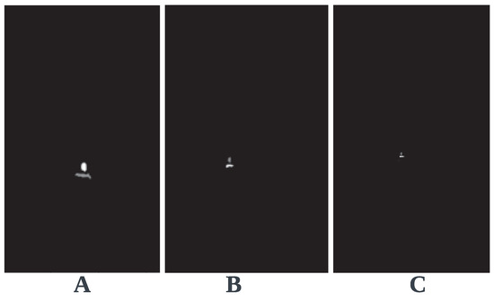 The predicted ground truth of black ice (A) at 10 m (white is concentrated ice in box and gray is the ice spread on the road), (B) 20 m, and (C) 30 m (white is ice spread on the road and the gray is the concentrated ice in the box.