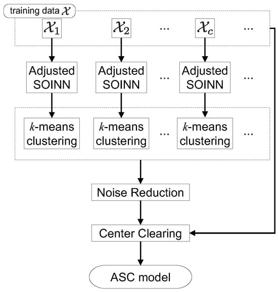Figure 1 shows the overview of CAEAC. The architecture of CAEAC is inspired by ASC []. As shown in Figure 2, ASC is an ASOINN-based supervised classifier incorporating k-means and two node clearance mechanisms after class-wise unsupervised self-organizing processes. The main difference between CAEAC and ASC is that CAEAC does not require k-means and node clearance mechanisms because CAEA has superior clustering performance to ASOINN.
