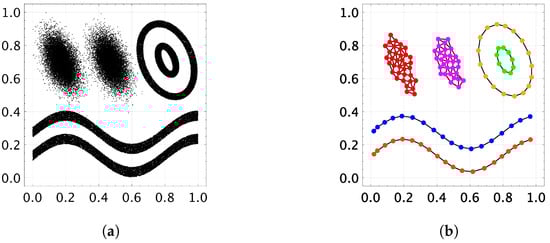Visualization of a self-organizing result by CAEA. The dataset consists of six distributions, and each distribution has 15,000 data points []. (a) Dataset. (b) Generated Network. In (a), a black dot represents a data point. In (b), a circle represents a node, and a black line between nodes represents an edge. If the nodes have the same color, it means that they belong to the same cluster.