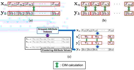 Equation (8) is known as Silverman’s rule []. Here, contains the bandwidth of a kernel function in CIM. In (8), contains the bandwidth of each attribute (i.e., is a d-dimensional vector). In this paper, the median of the d elements of is selected as a representative bandwidth of the Gaussian kernel in the CIM, i.e.,