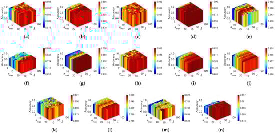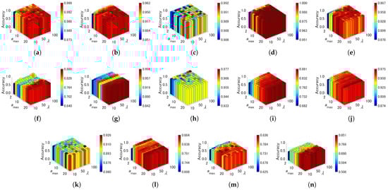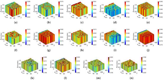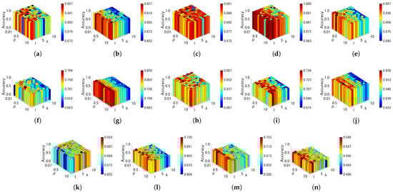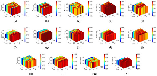 Effects of the parameter specifications of CAEAC-C on accuracy. (a) Aggregation. (b) Compound. (c) Hard Distribution. (d) Jain. (e) Pathbased. (f) ALLAML. (g) COIL20. (h) Iris. (i) Isolet. (j) OptDigits. (k) Seeds. (l) Semeion. (m) Sonar. (n) TOX171.