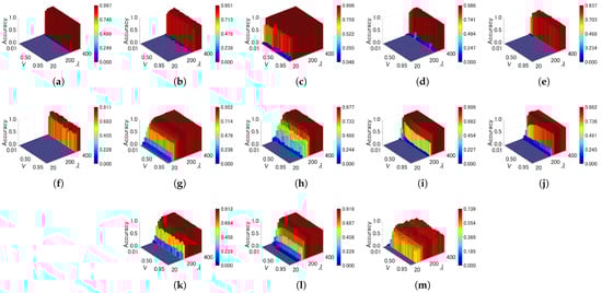 Effects of the parameter specifications of FTCAC on accuracy (TOX171 is N/A). (a) Aggregation. (b) Compound. (c) Hard Distribution. (d) Jain. (e) Pathbased. (f) ALLAML. (g) COIL20. (h) Iris. (i) Isolet. (j) OptDigits. (k) Seeds. (l) Semeion. (m) Sonar.
