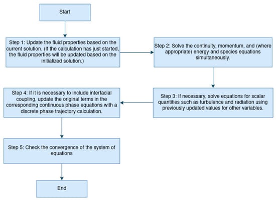 The density-based algorithm solves the basic equations of continuity, momentum, and (where appropriate) energy and matter transport simultaneously. The governing equations for additional scalars will be solved subsequently and sequentially (i.e., separately from each other and from the associated set). Since the governing equations are non-linear (and coupled), several iterations of the solve loop must be performed before a convergent solution is obtained. Each iteration consists of the steps described below in Figure 3.