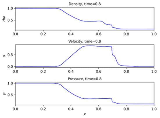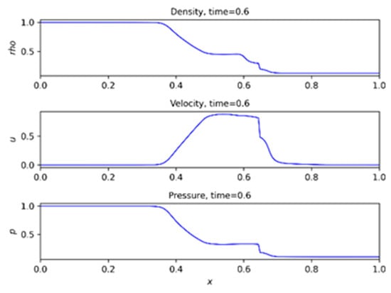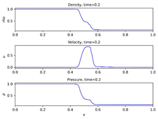 In our study, we considered the following architecture of PINN. The input to this architecture is two vectors of values t and tix, and the result is three vectors of values u, p, and ρ (velocity, pressure, and density). The main hyperparameters of PINN are presented in Table 1. The hyperparameter of the neural network is four hidden layers with 30 neurons in each layer, and the optimizing procedure is the Adam optimizer with a learning rate of 0.001. For each layer, the function of activation is the tanh function. The loss function is the MSE for the given data and initial condition, as presented in Equations (4) and (5).