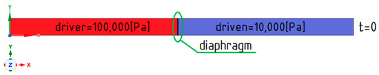 For this, a 2D shock tube model was used, which is a long metal tube consisting of two chambers and separated by a diaphragm. The diaphragm separates the high-pressure area from the low-pressure area. After the diaphragm is removed, the shock wave and the contact discontinuity begin to move to the region of initially low pressure, and the rarefaction wave moves to the region of initially high pressure (Khodadadi Azadboni et al., 2013, [38]). Two different solvers were used in the problem: driver and driven. The chamber used consists of two gases with a high-pressure ratio. Thus, one chamber is filled with high-pressure ideal gas, the driver, and the other chamber, vice versa, is low-pressure, and is called the driven. A schematic representation of the studied reservoir is shown in Figure 7. The length of this reservoir is Lb = 1 m and Hb = 0.03 m. When modeling, a piercing mechanism was built into the diaphragm, which breaks the diaphragm under given conditions. When the contact is suddenly broken, a series of pressure waves are created that cause a shock wave.