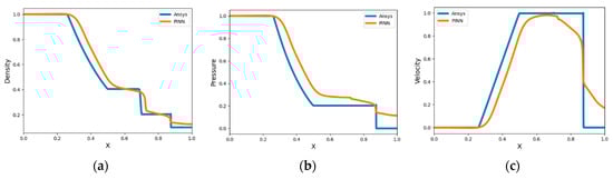 Figure 4, Figure 5 and Figure 6 show the prediction results using PINN for density, pressure, and velocity over time = 0.2, 0.6, 0.8, respectively. In these figures, we can notice that when the shock moved, the density changed from x = 0.5 and t = 0.2 to x = 0.7 and t = 0.8. It showed that the consistency of fluid was changing, i.e., the flow became saturated with rock particles; in our case, we observed that sedimentation occurred. The shock wave has a smooth trend, although it should be a sharp feature. In this paper, we will compare the PINN solution with the Ansys solution.