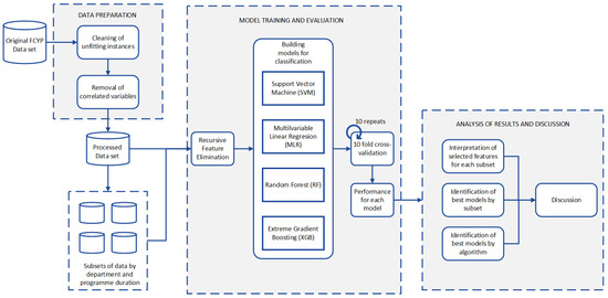 The objective of this study is to determine which variables best predict students’ outcomes in an introductory programming course offered to 20 engineering programmes at a Chilean university. To accomplish this, only variables that were recorded before the student enrolled in the course were used, including variables recorded upon the student’s admission to the university, the student’s performance during the first academic semester, and the theory and laboratory lecturers with whom each student registered for the course. The underlying hypothesis is that the current course design and implementation may not adequately address the diversity of student profiles, resulting in predetermined outcomes for many students. As a result, across the whole set of variables and across subsets of different students, classifiers were trained using Random Forests (RFs), Multivariate Logistic Regression (MLR), Support Vector Machines (SVMs), and Extreme Gradient Boosting (XGB). The course used for this study, “Fundamentos de Computación y Programación” (FCYP), is mandatory for 20 programmes imparted by the Faculty of Engineering at the Universidad de Santiago de Chile, 12 of which are 6 years long and the remaining 8 are 4 years long. For all programmes, the course is provided in the second semester of the first year, and it is preceded by first-semester common courses: Algebra I, Calculus I, Physics I, Introduction to Engineering, and Study Methods. The structure of the research presented in this paper is summarised in Figure 1 and further described in following sections.