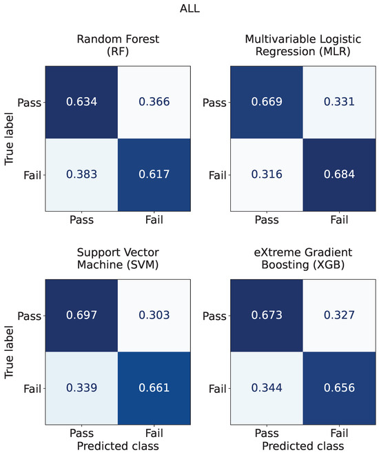 It is also interesting to note that the best model for all students (SVMs) achieved an accuracy of 67.71% with only two predictors, which is slightly below the best result obtained in previous work, where the best accuracy was 68.6% considering 21 predictors [27]. In this case, the same model exhibits better specificity (72.24%) than sensitivity (63.21%). This means it has a slightly lower number of false positive instances (students who failed but were classified as passing) compared to false negatives (passing students classified as failing), indicating that the model is more adept at detecting students who will not pass the course. The relatively lower accuracy in this particular instance, compared to the different subsets, may be attributed to the fact that the data set comprising all students presents a more challenging classification problem. It includes a significantly more diverse sample of students than any of the other subsets, reflecting the varied student profiles associated with each programme.