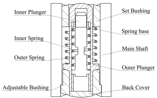 The entire device is placed in a radial through hole in the main shaft, and the device can only move along the radial direction of the main shaft. The set bushings and adjustable bushings are attached to the main shaft with threads. In the initial state, the outer spring is in a compressed state, the outer flyweight is pressed by the outer spring on the lower cock, and the displacement is limited. By adjusting the depth of the adjustable bushing screwed into the main shaft, the overall height of the plungers can be adjusted. Compared with the traditional single-plunger type overspeed protector [8], the outer plunger is a cavity, and the inner plunger, inner spring, and spring base can be placed in the cavity of the outer plunger. The back cover and the outer plunger are integrally connected by threads, and the inner spring is in a compressed state at this time, which can limit the movement of the inner plunger.