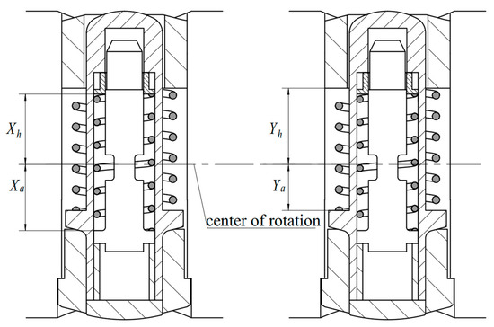 This means that the centrifugal force overcomes the frictional force between the outer plunger and the bushings and the spring force to make the inner plunger fly out along with the outer plunger. Since the eccentricity of the inner and outer plungers is ρ2 = r0 + xmax, the centrifugal force on the whole plunger is greatly increased, so ω1 < ω0, the value of the left polynomial in Equation (31) is smaller than that of the right polynomial, and the whole outer plunger flies outward.