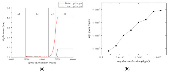 Results of simulation: (a) speed–displacement curve of the inner and outer plungers; (b) trip speed change curve of the inner plunger.