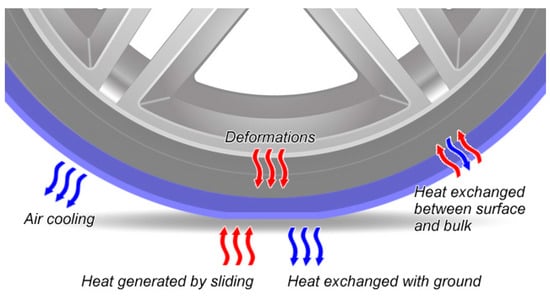 In such a context, it is worth remembering the extended studies of Farroni et al. [14] that, starting from the one-dimensional Thermo-Tyre model of De Rosa et al. [15], which is a simplified method devoted to determining the surface temperature of the rubber, developed the analytical-physical tri-dimensional model called “Thermo Racing Tyre” (TRT). Such a model takes into account all heat generation and flux exchange phenomena occurring inside the tyre. Allouis et al. [16] proposed a test procedure to evaluate the thermal diffusivity of tyres, to be used in the said TRT model, and even a further model called TRTLAb. Moreover, Farroni [17] developed the Tire/Road Interaction Characterization and Knowledge (TRICK) tool, which permits tuning the various models using the vehicle as a lab. Furlan et al. [18] provided an artificial neural network model to predict the friction coefficient, including a heat transfer model to calculate the tyre bulk temperature. Mavros [19] proposed a thermo-mechanical model based on an extensive study of the local flash temperature. Ebbot et al. [20] developed a model, based on finite element analysis (FEA), able to predict the thermal distribution inside the tyre at steady state. Lin et al. [21] developed a simulation procedure that combines dynamic mechanical tests and material tests in order to evaluate, through computer simulation, the temperature distribution. Even solid rubber tyres for aircraft have been studied. For instance, Chen et al. [22] developed a particular model from the thermo-mechanical point of view, acknowledging that the high heating of such parts of the airplane can threaten safety during the landing procedures.