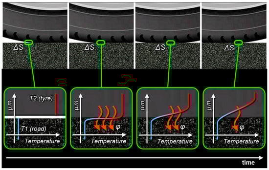 The tyre–road heat transfer mechanism is theorised starting from the description of what happens when the rolling tyre surface comes into contact with the ground and becomes part of the contact patch. In particular, the description takes into account a small part of the tyre tread surface ΔS [m2] and what happens inside the first infinitesimal layer of rubber in terms of the thermal gradient and thermal flux, φ, exchanged with the ground, as can be seen in Figure 2.