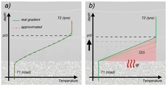 (a) Temperature gradient approximation between the tyre tread surface and the road. (b) Heat exchanged between the tyre tread surface and the road as a function of the temperature gradient penetration.