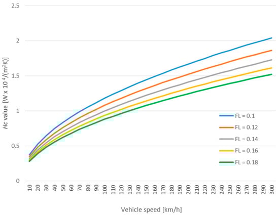 Analysing Figure 5, it can be confirmed that the value of 1.2 × 104 W/(m2K) remains suitable for high speeds: from 70 km/h, for the lightest footprint, related to very small cars, to 300 km/h, for the heaviest one. When low speeds are considered, it seems more adequate to use values one order of magnitude below. For example, it would be suitable to use 3.1 × 103 W/(m2K) for a speed range from 50 km/h to 10 km/h, representing typical city speeds. Nevertheless, if, for example, an FL of 0.18 is considered, the value of 130 km/h could be the lowest threshold where 1.2 × 104 W/(m2K) can be applied. Below such a speed, a lower Hc value should be considered. As a matter of fact, from the considerations above, an attentive Hc evaluation should not be a negligible step in the tyre thermal model definition. Actually, it must be remembered that the use of a completely wrong Hc provides, as a result, an unrealistic tyre behaviour, because such a coefficient should be able to offer an account of all of the heat discharged by the tyre through contact with the ground.