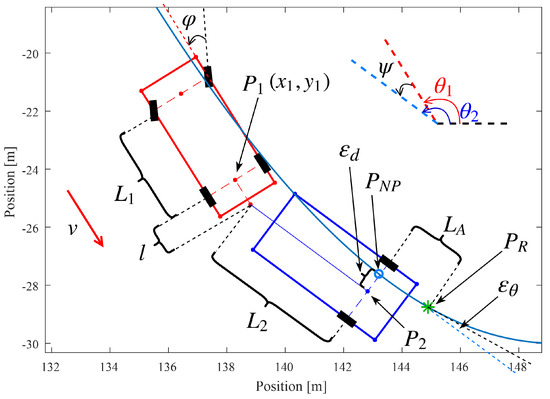 In a control-oriented model focused on low-speed scenarios, the steering kinematics of a tractor-trailer vehicle are determined by four distinct parameters: the wheelbase of the tractor vehicle, , spanning from the front to the rear axle; the wheelbase of the trailer vehicle, , extending from the hitch to the trailer’s axle; the hitch length, l, measured from the tractor’s rear axle to the hitch; and the longitudinal speed of the tractor, v, with negative values representing reverse motion. The used parameters and symbols are summarized in Table 2. The rear axle center location of the tractor, represented as , in the Earth coordinate frame, summarizes the control system model, as denoted in (1). It should be noted that the operator is utilized to alternate the model between forward and backward driving modes.
