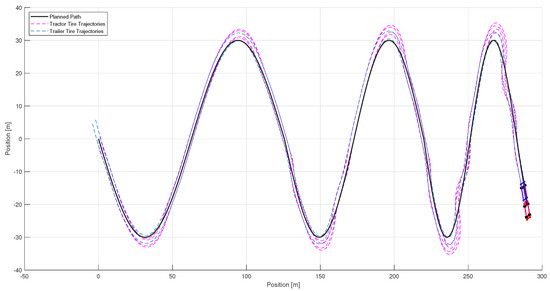 The developed sliding mode controller (SMC) for path tracking is assessed through simulation using a challenging path signal containing sharp turns representing difficult scenarios. This path was constructed from a series of multiple sinusoidal waves, each with varying frequencies, sequentially linked in order of increasing frequency. Supplementary path details, including curvature and heading angle, are inferred by fitting a quadratic function to the waypoints within a limited distance horizon. Initially, we tested the controller during forward motion, and the outcomes are illustrated in Figure 3. Notably, despite the fact that the controller parameters are not finely tuned, we observed effortless path tracking. This is attributed to the system’s inherent stability during forward motion.