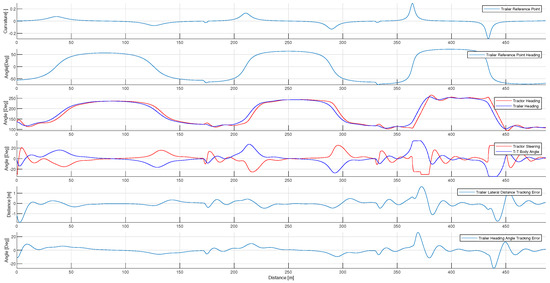 In reverse motion, the challenge escalates due to the potential for jackknifing if errors accumulate. This phenomenon, where the trailer pushes the towing vehicle from behind, causes it to spin around, leading to hazardous situations. Figure 4 displays the outcome when driving backward from an off-path starting position. This visualization offers a clear picture of how the vehicle behaves under various conditions. The demonstrated path-tracking outcomes primarily focus on evaluating the trailer vehicle’s tracking accuracy. Accurate tracking ensures that the trailer stays on course, reducing the risk of accidents and enhancing overall safety. We measure this performance using multiple metrics, as shown in Figure 5.