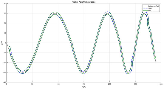 When assessing the Heading Angle Error, both controllers perform similarly. The SMC has a slightly better RMSE at 0.10284, whereas the ENN’s RMSE is marginally higher at 0.10403. The difference is minimal, suggesting that, in terms of heading angle tracking, both controllers are nearly equivalent in performance. However, a distinct advantage of the SMC controller is its ease of implementation. While neural networks may require extensive training, parameter tuning, and validation on diverse datasets, SMC controllers are often simpler to design, implement, and validate, especially for systems with known dynamics. This ease of implementation can lead to faster deployment times and reduced complexities, particularly valuable in scenarios where rapid prototyping or deployment is essential. In summary, the NN controller demonstrates superior performance in lateral distance tracking, but the simplicity and straightforwardness of implementing the SMC controller make it an attractive choice for certain applications. A predictive path-tracking control design can potentially reduce such error peaks, but it involves substantial computational effort, particularly when the model’s inherent nonlinearity complicates the optimization problem. The sliding mode controller, with its robustness against uncertainties and its ability to handle nonlinearities, proves to be a viable solution for maintaining the desired trajectory, even with the presence of model uncertainties and external disturbances, providing a balance between performance and computational efficiency.