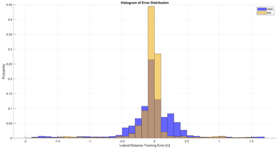In the side-by-side comparison shown in Figure 7 and Figure 8, we can observe the error distribution of the Lateral Distance Tracking Error and the Heading Angle Error, respectively, presented in the form of histograms. These histograms provide a visual representation of the frequency distribution of errors, allowing us to easily compare the performance of the Neural Network (NN) controller and the Sliding Mode Control (SMC) controller. Specifically, focusing on the Lateral Distance Tracking Error, the histogram in Figure 7 clearly demonstrates that the NN controller has a tighter and more centralized distribution of errors compared to the SMC controller. This is quantitatively supported by the Root Mean Square Error (RMSE) values, with the NN controller achieving a lower RMSE of 0.32651, compared to the SMC controller’s RMSE of 0.44742. The lower RMSE value and the concentrated distribution of errors in the histogram indicate that the NN controller is more accurate and consistent in tracking lateral distance, successfully minimizing deviations from the desired path.