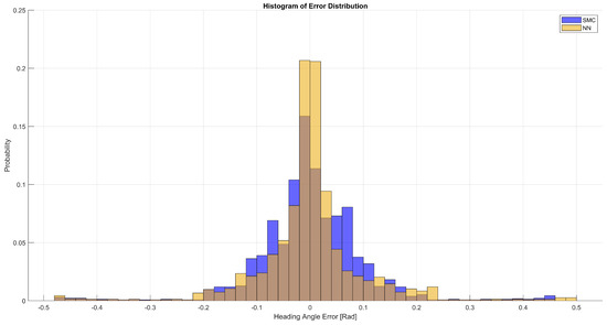 Histogram of the heading angle error distribution for both SMC and NN. Brown color represents the overlap between SMC and NN.