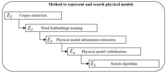 In the context of the semantic reuse of physical models, we have designed a five-step method was (see Figure 1) to illustrate the relevant aspects involved in moving from a domain-specific representation of a physical model to a word-vector representation used to implement a retrieval system. Our main objective was to establish a structured graphical representation of physical models able to encompass model elements and their relationships within a graph. Subsequently, this graphical representation formed the baseline for the generation of detailed textual descriptions of these models. This approach enables queries that are based on metadata while additionally serving as content, thereby allowing the retrieval of information based on the inherent content and semantic concepts of the model.