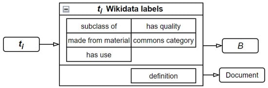 In the case of reusing Simulink physical models, the names of the elements of the physical models from Simulink’s official documentation were used as input, and similar elements were searched in Wikidata. Specifically, for each term in the input set A (where ), a new output set of terms B is obtained from the labels, as shown in Figure 2. For each , a document is obtained with the definition extracted from the Encyclopædia Britannica, which becomes part of the training corpus C. In the next iteration, the output set B becomes the input set A. In total, a set of 9620 terms was discovered in this process.