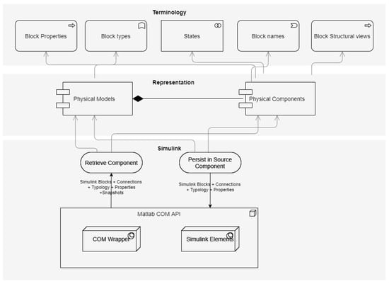- Model Layer: this layer represents a critical component that enables interaction with the different modelling frameworks and platforms. It facilitates the retrieval of relevant data from physical models, encompassing elements such as blocks, systems, subsystems, properties, and even visual representations. Within this layer, a connector must be customised to harness platform-specific technologies and Application Programming Interfaces (APIs), facilitating the retrieval of data associated with the models. Subsequently, these data are processed and organised in accordance with the data model established within the rendering layer. In the case of Simulink, this layer facilitates all interactions with MATLAB Simulink. It utilises COM technology to retrieve information about the elements that constitute the physical models, including blocks, systems, subsystems, properties, and even image snapshots. Within this layer, two components were developed that leverage the MATLAB interop engine [30] to execute commands from the MATLAB console and perform Simulink model component recovery operations. The retrieved information is then processed and represented in the data model defined in the rendering layer.