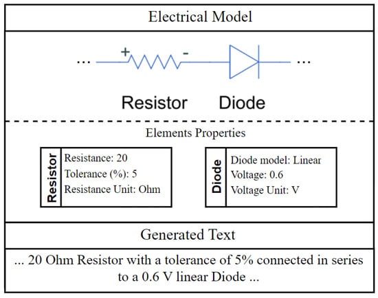 To retrieve information, a dataset of models was created. A connector was developed to extract embedded information from Simulink models, and these data were converted to text. This description was generated with a pattern containing the component names, types, relationships, and property information (see Figure 5).