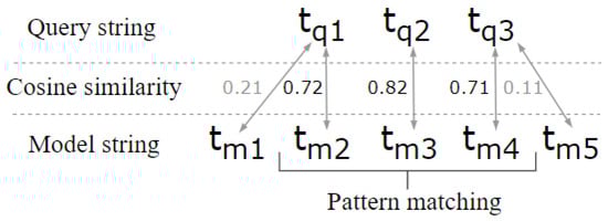 - Pattern Matching: in this step, the algorithm searches for the semantic pattern of the input query to be matched in the models. The model text and the query text are processed using NLP techniques, such as tokenisation and normalisation, to calculate the cosine similarity d between the resulting terms of the query and model . If the cosine similarity of in is consecutively higher than the value of set in the algorithm, then the model is assigned a weight . In this way, the models that match the pattern return a higher similarity than the others (see Figure 6).