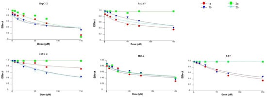Cytotoxicity of compounds 1a, 1b, 2a, and 2b was studied in vitro as ability to interfere with cell survival on a panel of different tumor cells lines by MTT conversion assay []. The IC50 values obtained from dose–response curves (shown in Figure 2) or the percentage cell viability values obtained at the maximum of tested dose (150 µM) were collected (Table 1). As evidenced by the curves in Figure 2 1b, 2a and 2b compounds showed comparable toxicity to the HepG-2 cell line in reference to 1a (70 ± 2 µM); in particular; 1b showed the highest toxicity value with an IC50 equal to 58 ± 4 µM (See Table 1). Moreover, 1b induced comparable cytotoxicity to 1a on U87 and CaCo-2 cells, and 2b on HeLa cell lines. Compounds 2a and 2b showed no toxicity on U87, CaCo-2 or MCF7 cell lines at the tested concentration of 150 µM (Table 1).