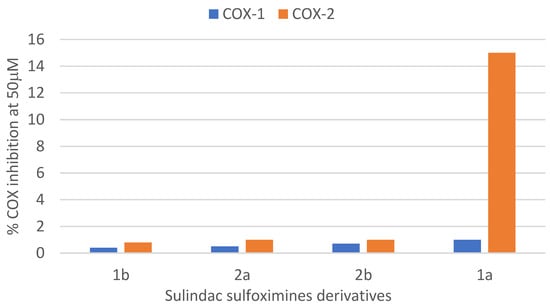 Only sulindac-OMe (1a) (Figure 3) has a very slight inhibitory activity (15% at 50 µM) against the COX-2 isoform. All other sulfoximine derivatives were found to be inactive (around 1% at 50 µM) in inhibiting both cyclooxygenase isoforms, but this does not hinder the activity of sulindac sulfide, since sulfoximines are “in vivo” metabolized by CytP450, and thus may also be considered prodrugs of sulindac sulfide itself.