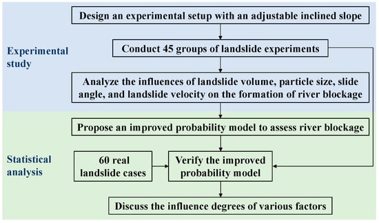 To experimentally reveal the influences of slope characteristics, landslide volume, and particle size on the formation of landslide dams and river blockage, an adjustable slide chute that includes the functions of landslide and dynamic water flow was designed and built, and forty-five repeatable landslide experiments were carried out in this chute. Some typical landslide movement processes, including debris sliding, water flow, and dam deposition, were recorded to analyze the influences of these three factors. The influences of more factors were investigated by a statistical investigation of sixty real landslide cases. Based on the forty-five experiments and the sixty landslide cases, an improved probability model for predicting the degree of river blockage was established, and its accuracy was analyzed based on experimental results and real landslide cases. Finally, the degrees of influence of various factors were discussed. A flow chart is shown in Figure 1 to illustrate the methodologies and processes of this study. The experimental findings and proposed model could improve the risk assessment of landslide disasters and secondary hazards, and they are also helpful in identifying vulnerable areas and developing mitigation strategies.
