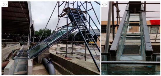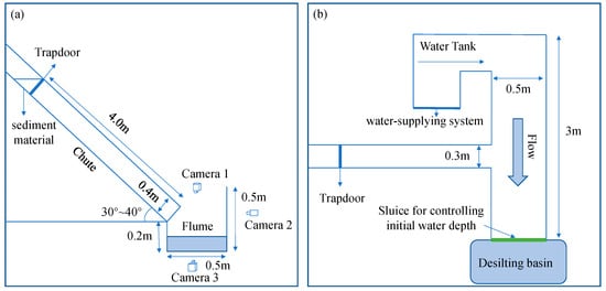An experimental apparatus was built to simulate the formation and evolution processes of river blockages. The experimental setup consisted of four parts: sediment material container, inclined slide chute, river flume, and desilting basin, as shown in Figure 2 and Figure 3. Considering the complex and diverse topographic conditions of slopes, the chute was set up as an adjustable inclined slope to simulate different slope gradients and landslide height conditions. The angle adjustment device was made up of a steel frame and a lifting device. By adjusting the lifting device, the dip of the chute can be changed from 30° to 40°, and the corresponding landslide height varies from 2.0 m to 2.57 m. The inclined chute has a length of 4.0 m, a width of 0.3 m, and a depth of 0.4 m. Its surface and two lateral walls are made of glass to facilitate observation. The river flume has a length of 6 m and a gradient of 0.88%. Its rectangular cross-section is 0.5 m in width and 0.5 m in depth. The flume bottom and lateral walls are also composed of glass. Transparent material panels are used to build the chute and the flume to facilitate observation of the landslide process. The sediment material container is seamlessly connected to the chute, and a trapdoor is used to control landslide materials initiating simultaneously and the acceleration of the sliding motion from rest.