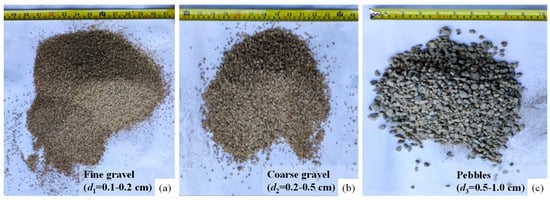 It is difficult to simulate the particle size distribution of landslide materials, which is very complicated for a real landslide and varies markedly between landslides. Thus, this experiment is designed not to simulate a real landslide but to investigate some basic mechanisms of river blockage caused by landslides. Based on this consideration, three types of typical and highly operable sands were used to represent landslide materials in the experiment. To study the influence of different material sizes on landslide dams and river blockages, the materials were divided into fine gravel (d1 = 0.1~0.2 cm), coarse gravel (d2 = 0.2~0.5 cm), and pebbles (d3 = 0.5~1.0 cm). Particle sizes are not uniform but encompass a range of sizes in each category to better simulate the landslide mass. In addition, they were dried by the same dehydrator to minimize different variables other than particle size. The different types of materials used in this experiment are shown in Figure 4.
