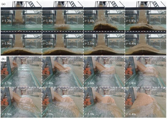 Sequences of the landslide dam formation at different times. (a) Front view; (b) left side view.