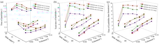 Changes in event time. (a) Variation in landslide movement time; (b) variation in landslide dam formation time; and (c) variation in total landslide movement time.