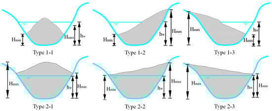 The different types of river blockage are summarized in Figure 7, where three characteristic heights are marked as the stable water depth hw, the maximum dam height Hmax, and the minimum dam height Hmin. According to the relationships between these three characteristic heights, river blockages are characterized into six types, as listed in Table 2.