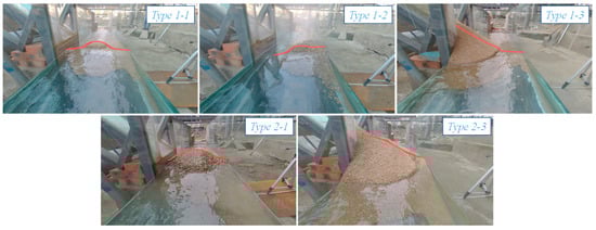 Based on the images of the landslide dams recorded by the cameras, only five types of river blockages were observed in these experiments, as listed in Table 2. Because the chute exit is lower than the stable water surface, type 2-2 was not observed in these experiments. Typical experimental landslide dams for the five types are presented in Figure 8. The landslides entered into the flume, and the heads of the landslides slowed the rear landslides. Large volumes of landslide material will accumulate in the chute. If the height of landslide deposition on the side where it enters the flume surpasses the height of the chute’s exit, then further landslide movement could be prevented by this outcrop of material; thus, not all landslide material could enter the flume. In this case, the landslide dam is highest on the landslide side and lowest on the opposite side, which is characteristic of blockage types 1-3. The main reason for the difference between types 1-2 and 1-3 is the difference in velocity entering the flume. As the slide angle and particle size increase, the cross-section type of the landslide dam will gradually transform to type 1-2. When a large volume of landslide material moved at a slow velocity, the landslide formed a complete blockage dam of type 2-3, in which Hmax appeared on the landslide side. With a steeper slope, larger particle size, and larger material volume, landslides are more likely to result in dam type 2-1, which presents as a completely blocked channel with Hmax near the center axis of the dam.